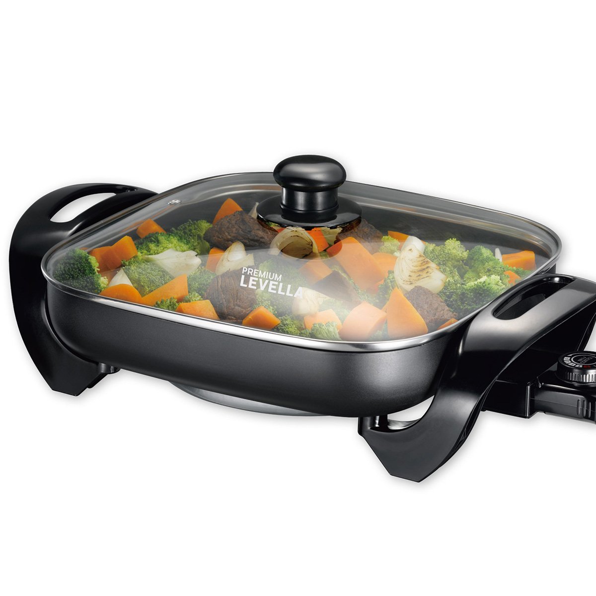 Nonstick coating inside. Adjustable temperature control. Cool touch handles and base. 12″ x 12″ Surface Skid-resistant feet. Dishwasher safe without temperature control. Tempered glass lid. Useful for different meals. Power: 1,200 Watts.