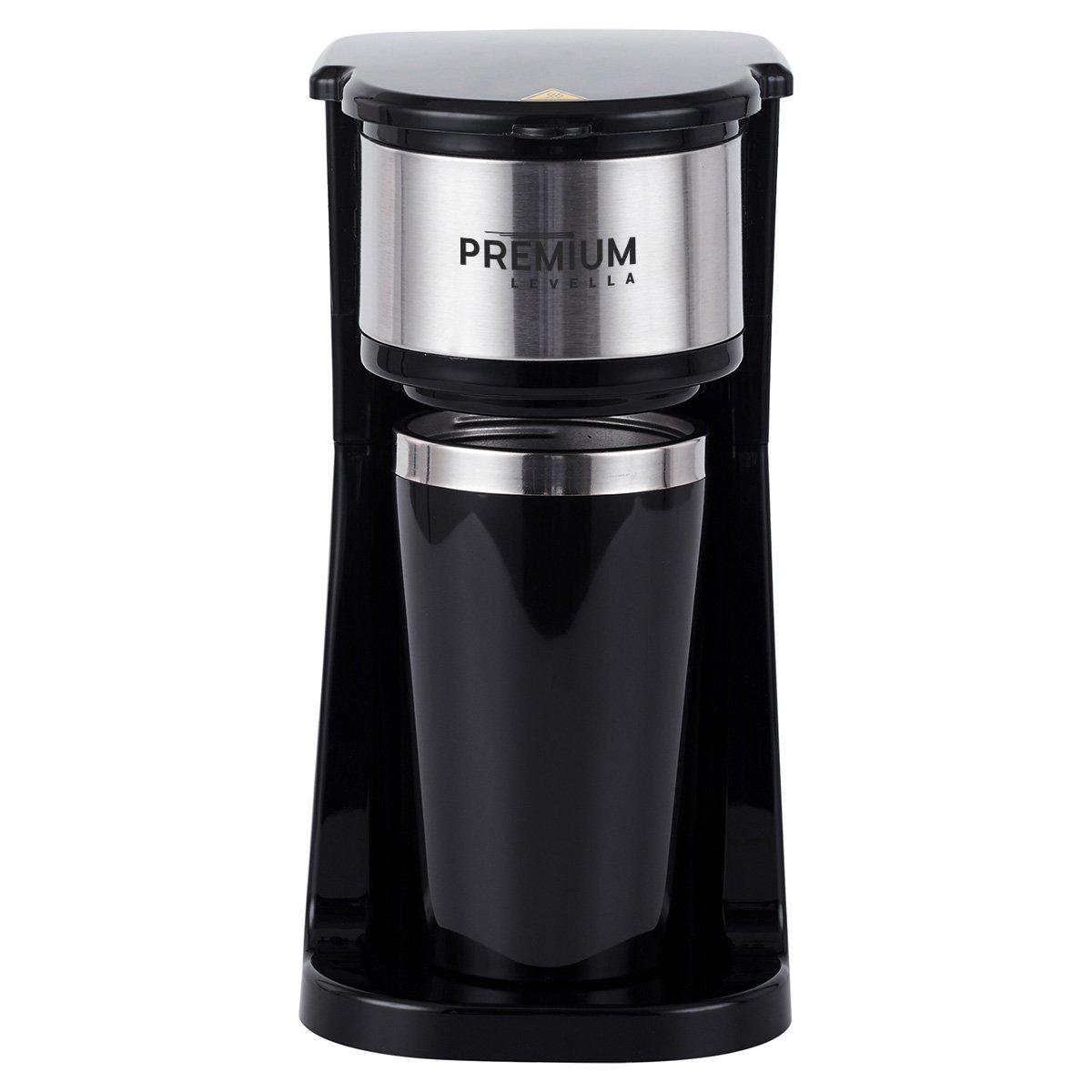Dual brew: use ground coffee and reusable mesh filter, or round soft coffee pods One-Touch operation button with neon light indicator. Automatic shutoff. 14 OZ S.S. Travel mug with plastic body and airtight. Water tank capacity: 14 Oz. Permanent mesh filter. One-Touch operation button with neon light indicator. Perfect for dorms, offices, small rooms, and more. Travel mug convenient for take to work , gym, traveling or outside drinking. Power: 700 Watts.