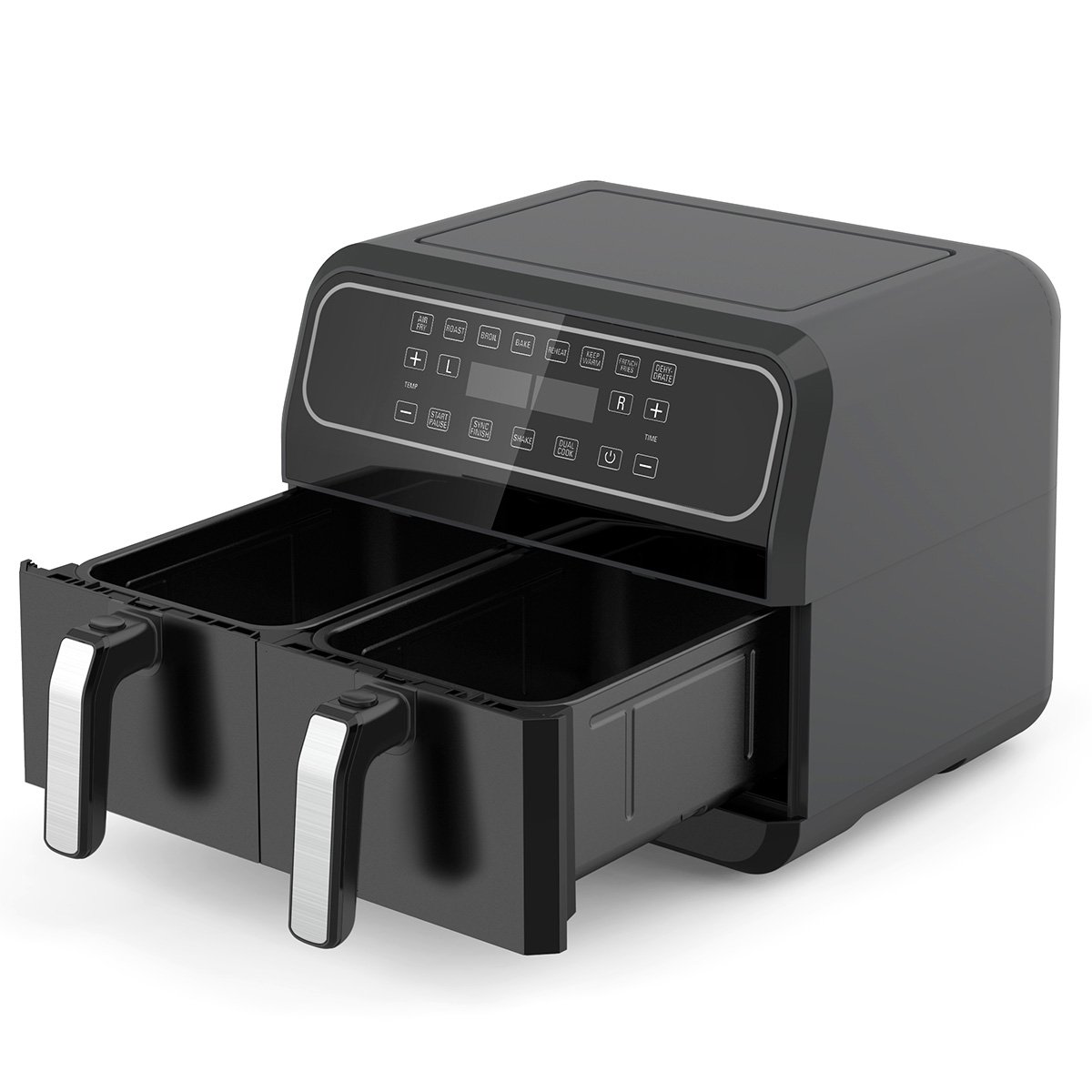 8 Functions include air fryer, roast, broil, bake, reheat, keep warm, french fries and dehydrate. Fry, grill, roast and bake your dishes with little or no oil. 60-Minute timer with automatic switch-off with bell. (2) 4.2 qt Removable baskets that allow you to cook different foods at the same time. Big dual touchscreen control. Less Fat. Control for a synchronized finish. Touch sensor interface. Great crispy-fried taste with air heating up to 400?F. Easy cleaning removable parts, dishwasher safe. Power: 1,800 Watts.